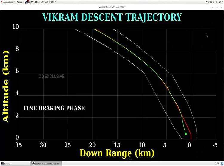 लैंडिंग की रात को पूरा देश इसरो के मिशन ऑपरेशन कॉम्प्लेक्स (MOX) की स्क्रीन पर लगे एक ग्राफ के माध्यम से विक्रम लैंडर की लैंडिंग देख रहा था। इसी ग्राफ से यह सच्चाई सामने आई है। ग्राफ में तीन लाइन देखी जा रही थी, जिसमें बीच की लाल रंग की रेखा चंद्रयान-2 के विक्रम लैंडर का रास्ता दर्शा रही थी। यह लाइन इसरो वैज्ञानिकों की ओर से विक्रम लैंडर के लिए पूर्व निर्धारित मार्ग था। हालांकि, विक्रम लैंडर का असली टाइम पाथ हरे रंग की लाइन में दिख रहा था, जो कि लैंडर के सफर के साथ-साथ लाल लाइन के ऊपर ही बनता जा रहा था।