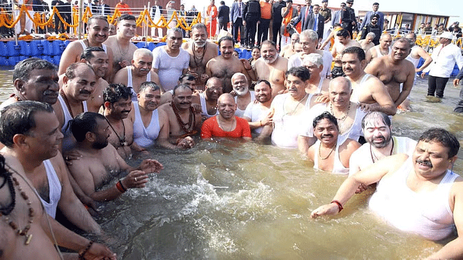 नई दिल्ली। महाकुंभ नगर में बुधवार को मंत्रिपरिषद की बैठक संपन्न होने के बाद सीएम योगी आदित्यनाथ मंत्रियों के साथ संगम पहुंचे और डुबकी लगाई। उनके साथ डिप्टी सीएम केशव प्रसाद मौर्य व ब्रजेश पाठक के साथ ही मंत्रियों ने भी स्नान किया।