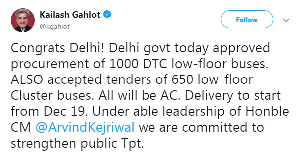प्रेस कांफ्रेंस में मंत्रिमंडल के फैसलों की जानकारी देते हुए परिवहन मंत्री कैलाश गहलोत ने बताया कि 1000 लो फ्लोर बस क्लस्टर में 650 के टेंडर की स्वीकृति मिल गई है, जबकि 350 बसों का टेंडर जल्द ही शुरू होगा। उन्होंने बताया कि 1000 इलेक्ट्रिक बसों का टेंडर खुल चुका है। जनवरी से अप्रैल तक ये सभी बसें आ जाएंगी। इन बसों के आने से डीटीसी के बेड़े में 9500 बसें हो जाएंगी।