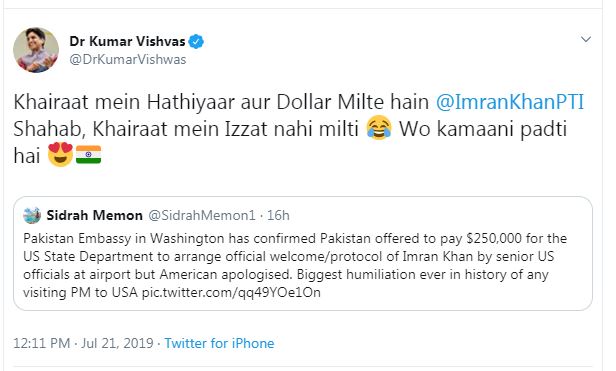 ट्विटर पर बनाए जा रहे इमरान खान के मजाक पर मशहूर कवि और पूर्व आप नेता कुमार विश्वास भी पीछे नहीं रहे। अमेरिका पहुंचने पर इमरान की हुई बेइज्जती पर कुमार विश्वास ने ट्विटर पर लिखा कि खैरात में हथियार और डॉलर मिलते हैं इमरान खान साहब, खैरात में इज्जत नहीं मिलती वो कमानी पड़ती है।