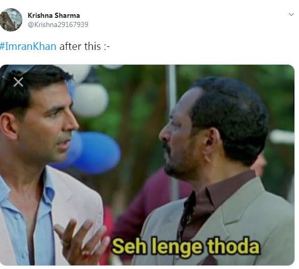 इमरान खान का अमेरिका में स्वागत नहीं होने पर लोग सोशल मीडिया पर कई मजाकिया कमेंट कर रहे हैं। एक ट्विटर यूजर ने लिखा, ‘पाकिस्तान ने क्रिकेट विश्व कप में अच्छा प्रदर्शन नहीं किया। यह उसी की सजा है।’ वहीं, एक ट्रोलर ने मीम्स बनाते हुए वेलकम फिल्म के एक फोटो पर लिखा कि ‘सह लेंगे थोड़ा’।