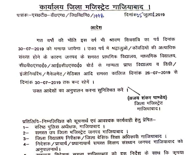 इसलिए प्रशासन इनकी सुविधा और किसी तरह की अनहोनी को टालने के लिए सुरक्षा के उपाय के तौर पर स्कूलों को बंद कर दिया है। इस बार प्रशासन ने 26 जुलाई से 30 जुलाई तक सभी प्राथमिक विद्यालय, माध्यमिक विद्यालय, सीबीएसइ, आइसीएसइ बोर्ड से मान्यता प्राप्त स्कूल के साथ सभी इंजीनियरिंग और मेडिकल कॉलेजों को बंद करने का आदेश दिया है। यह आदेश जिला मजिस्ट्रेट गाजियाबाद ने जारी किया है। वहीं मेरठ और मुजफ्फरनगर के भी सारे स्कूलों को भी प्रशासन ने बंद कर दिया है।