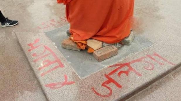 स्वामी विवेकानंद की प्रतिमा के नीचे अभद्र टिप्पणी (फोटो-कुमार)