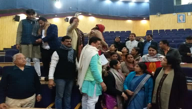 दरअसल, पूर्वी दिल्ली नगर निगम का आज अंतिम बजट पेश किया जा रहा था. बजट पेश करने के दौरान विपक्षी दल के पार्षदों की ओर से लगातार नारेबाजी की जा रही थी. इसी क्रम में विपक्षी दल के पार्षद सत्ता पक्ष के आसन के करीब आकर नारेबाजी करने लगे. जिसके बाद सत्ता पक्ष की एक महिला पार्षद भावना मलिक ने विपक्षी दल की महिला पार्षद रेखा सान्याल को धक्का दे दिया. जिसके बाद वहां का माहौल गरमा गया. हंगामा बढ़ता देख मेयर अंजू कमलकांत के आदेश पर वहां मौजूद मार्शलों ने पार्षदों को अलग किया.