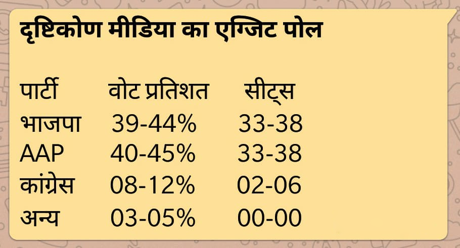 एक तरफ जब सभी टीवी चैनल्स और सर्वे संस्था आम आदमी पार्टी को प्रचंड बहुमत दिखा रहे है तो दृष्टिकोण मीडिया ने अपनी टीम की ग्राउंड रिपोर्ट के आधार पर ऐसा एग्जिट पोल जारी किया है. जो वास्तविकता के भी करीब है और आम आदमी पार्टी के माथे पर चिंता की लकीर डालने वाला भी है. इस एग्जिट पोल काे जारी करने वाले दृष्टिकोण मीडिया के चीफ एडीटर दुष्यंत चाेपडा का कहना है कि उनके एग्जिट पोल में सभी 70 विधानसभा का शाम 6 बजे तक का सर्वे शामिल है.