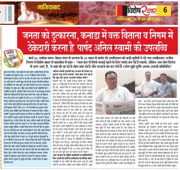 निर्दलीय पार्षद चुने गए अजीत निगम ने नामांकन के बाद विशेष खबर मीडिया समूह के नेेेहरू नगर सेकेंड स्थित प्रशासनिक कार्यालय में आकर प्रधान संपादक विनीत कांत पाराशर से मुलाकात कर उन्हें पुष्प गुच्छ भेंट किए और जीत का आर्शीवाद लेकर जीत का चुनाव की रणनीति तैयार की थी। विशेष खबर से बातचीत में अजीत निगम ने कहा था कि अगर क्षेत्र की जनता ने उन्हें अपना पार्षद चुना तो सप्ताह के सात दिन और 24 घंटे जनता की सेवा में हाजिर रहेंगे।