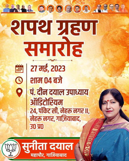 मेयर सुनीता दयाल सहित 100 वार्ड पार्षदों का शपथ ग्रहण समारोह नेहरूनगर स्थित पंडित दीनदयाल उपाध्याय ऑडिटोरियम में शनिवार शाम 4 बजे शुरू होगा। यहां पर करीब एक हजार लोगों के बैठने की व्यवस्था रहेगी। ऑडिटोरियम में दो गेट हैं। एक गेट से मेयर और पार्षदों को एंट्री मिलेगी। दूसरे गेट से आम पब्लिक को एंट्री दी जाएगी। इस कार्यक्रम में जिले के प्रभारी मंत्री असीम अरुण, केंद्रीय राज्यमंत्री एवं गाजियाबाद सांसद जनरल वीके सिंह सहित भाजपा के सभी जनप्रतिनिधि भी मौजूद रहेंगे। नगर निगम के अधिकारियों ने गुरुवार को ऑडिटोरियम में शपथ ग्रहण की तैयारियों को अंतिम रूप दिया।