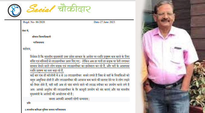 सोशल चौकीदार के के शर्मा ने लाउडस्‍पीकर से ध्‍वनि प्रदूषण फैला रहे फेरी वालों के खिलाफ कार्रवाई के लिए डीएम को लिखा पत्र