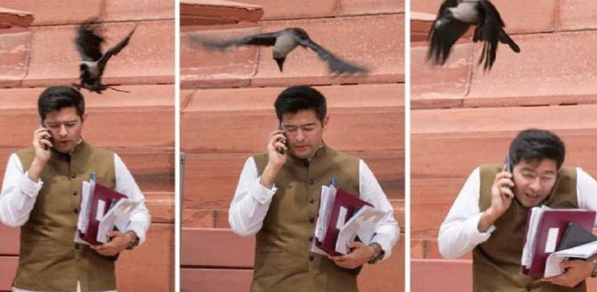 नई दिल्ली। आम आदमी पार्टी (आप) सांसद राघव चड्ढा पर मंगलवार को संसद परिसर में फोन पर बात करते समय एक कौवे ने हमला कर दिया। इस पल को समाचार एजेंसी पीटीआई के एक फोटोग्राफर ने कैद कर लिया और तस्वीरें जल्द ही इंटरनेट पर वायरल हो गईं। तीन से चार तस्वीरों की एक शृंखला में चड्ढा के सिर के ऊपर से एक कौआ उड़ता हुआ और उनके सिर के ऊपर चोंच मारते हुए दिखाई दे रहा है, जब वह राज्यसभा की कार्यवाही में भाग लेने के बाद सदन से बाहर आ रहे थे। इसे देख चौंकते हुए चड्ढा नीचे झुक गए और बाल बाल बचे।