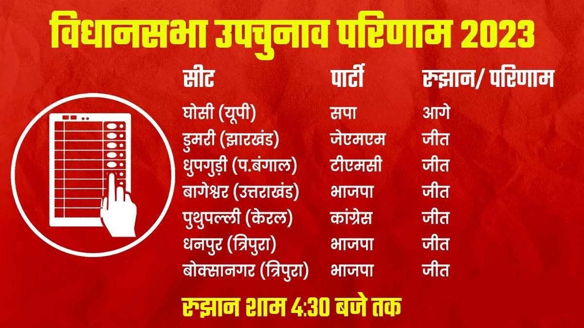 त्रिपुरा की दोनों सीटें- धनपुर और बॉक्सानगर सीट और उत्तराखंड की बागेश्वर सीट पर बीजेपी जीत गई है। केरल में कांग्रेस और पश्चिम बंगाल में तृणमूल कांग्रेस ने जीत दर्ज की है। झारखंड में I.N.D.I.A अलायंस से JMM ने जीत दर्ज की है। उत्तर प्रदेश की घोसी सीट समाजवादी पार्टी ने जीत ली है।