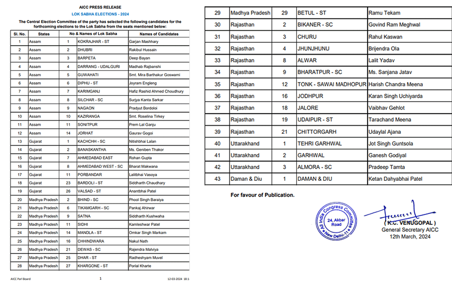नई दिल्ली। कांग्रेस ने आगामी लोकसभा चुनाव के लिए 12 मार्च को 43 उम्मीदवारों की अपनी दूसरी सूची जारी की है। केसी वेणुगोपाल ने  एक संवाददाता सम्मेलन में उम्मीदवारों की दूसरी सूची जारी की है। इस मौके पर कांग्रेस के कोषाध्यक्ष अजय माकन और मीडिया विभाग के प्रमुख पवन खेड़ा भी मौजूद रहे। कांग्रेस महासचिव केसी वेणुगोपाल ने कहा कि हमने लोकसभा चुनाव के लिए अपने उम्मीदवारों की पहली सूची पहले ही घोषित कर दी है। आज, हम दूसरी सूची की घोषणा करने जा रहे हैं। कल सीईसी ने बैठक की और असम, मध्य प्रदेश, राजस्थान से लगभग 43 नामों की सूची को मंजूरी दे दी है। कांग्रेस महासचिव केसी वेणुगोपाल ने कहा कि कांग्रेस सांसद गौरव गोगोई असम के जोरहाट से चुनाव लड़ेंगे। नकुलनाथ मध्य प्रदेश के छिंदवाड़ा से चुनाव लड़ेंगे। राहुल कस्वा राजस्थान के चुरू से चुनाव लड़ेंगे। वैभव गहलोत जालोर से चुनाव लड़ेंगे। इस सूची में 43 उम्मीदवारों में से 10 जनरल उम्मीदवार, 13 ओबीसी उम्मीदवार, 10 एससी उम्मीदवार, 9 एसटी उम्मीदवार और 1 मुस्लिम उम्मीदवार हैं।