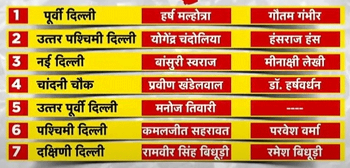 बता दें कि बीजेपी ने अपनी रणनीति में बदलाव करते हुए 2 बार के सांसद और पूर्व केंद्रीय मंत्री हर्षवर्धन की टिकट काटकर प्रवीण खंडेलवाल को चांदनी चौक लोकसभा सीट से उम्मीदवार बनाया है. वहीं, पश्चिमी दिल्ली सीट से 2 बार के सांसद परवेश सिंह वर्मा की जगह कमलजीत सहरावत, दक्षिणी दिल्ली से बीजेपी ने रमेश बिधूड़ी की जगह रामवीर सिंह बिधूड़ी, नई दिल्ली लोकसभा सीट से मीनाक्षी लेखी की जगह दिवंगत नेता सुषमा स्वराज की बेटी बांसुरी स्वराज को मैदान में उतारा है. उत्तर पश्चिमी दिल्ली से हंसराज हंस की जगह योगेश चंदोलिया को टिकट दिया गया है. पूर्वी दिल्ली से गौतम गंभीर की जगह हर्ष मल्होत्रा और उत्तर पूर्वी से फिर से मनोज तिवारी को मैदान में उतारा है.