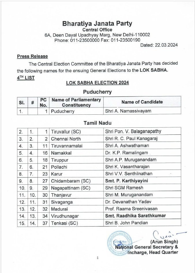 नई दिल्‍ली। लोकसभा चुनाव 2024 के लिए बीजेपी ने अपने उम्मीदवारों की एक और लिस्ट जारी कर दी है। इस लिस्ट में तमिलनाडु और पुडुचेरी के उम्मीदवारों की घोषणा की गई है। बीजेपी की इस लिस्ट में कुल 15 उम्मीदवारों के नाम हैं। इनमें से तमिलनाडु के लिए 14 नामों का एलान किया गया है।