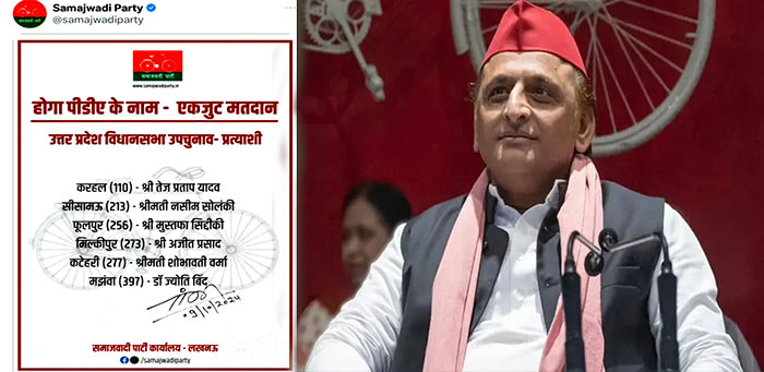 समाजवादी पार्टी ने जिन सीटों पर प्रत्याशी घोषित किए हैं, उनमें करहल, सीसामऊ, फूलपुर, मिल्कीपुर, कटेहरी और मंझवा सीट शामिल है। सपा ने करहल से तेज प्रताप यादव, सीसामऊ से नसीम सोलंकी, फूलपुर से मुस्तफा सिद्दीकी, मिल्कीपुर से अजीत प्रसाद, कटेहरी से शोभावती वर्मा और मंझवा से ज्योति बंद को टिकट दिया है। अभी मीरापुर, कुंदरकी, गाजियाबाद सदर और अलीगढ़ की खैर विधानसभा सीट बाकी हैं, जिन पर उम्मीदवारों के नामों का ऐलान होना है।