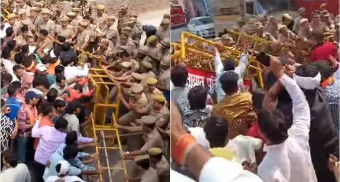 महापंचायत में जाने के लिए जब 400 से ज्यादा लोग इकट्ठा हो गए तो उन्होंने बैरिकेड को पलट दी। पुलिस और लोग आमने-सामने आ गए हाथापाई की नौबत पहुंच गई। पुलिस ने लाठी फटकारी और किसी तरह लोगों को काबू किया। इस दौरान भगदड़ जैसा माहौल पैदा हो गया। बड़ी तादाद में लोग इसके बाद वापस लौट गए। वहीं, विधायक नंद किशोर गुर्जर को जब अंदर नहीं जाने दिया गया तो उन्होंने वहीं पर महापंचायत करने की घोषणा कर दी। उन्होंने डासना मंदिर के बाहर प्रदर्शन करने समेत अन्य मामलों में एनएसए की कार्रवाई करने की मांग की। उन्होंने पुलिस अधिकारियों पर भी तमाम आरोप लगाए।