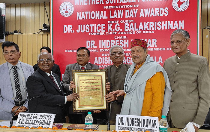गाजियाबाद। संविधान दिवस के अवसर पर गत दिवस इंडियन ला इंस्टीट्यूट,नई दिल्ली (सर्वोच्च न्यायालय भवन के सामने) के मुख्य हाल में आयोजित एक भव्य समारोह में गाजियाबाद बार एसोसिएशन के पूर्व अध्यक्ष एवं लायंस क्लब नोएडा व अधिवक्ता परिषद गौतमबुद्धनगर के संस्थापक अध्यक्ष लायन दर्शनानंद गौड़ ,एडवोकेट को *नेशनल ला दिवस अवार्ड* से सम्मानित किया गया। भारत के पूर्व मुख्य न्यायाधीश माननीय न्यायमूर्ति के. जी. बालाकृष्णन एवं राष्ट्रीय स्वयंसेवक संघ की राष्ट्रीय कार्यकारिणी के वरिष्ठ प्रचारक श्री इन्द्रेश एवं हरियाणा के एडवोकेट जनरल बलदेव महाजन द्वारा उन्हें संयुक्त रूप से सम्मानित किया गया।
