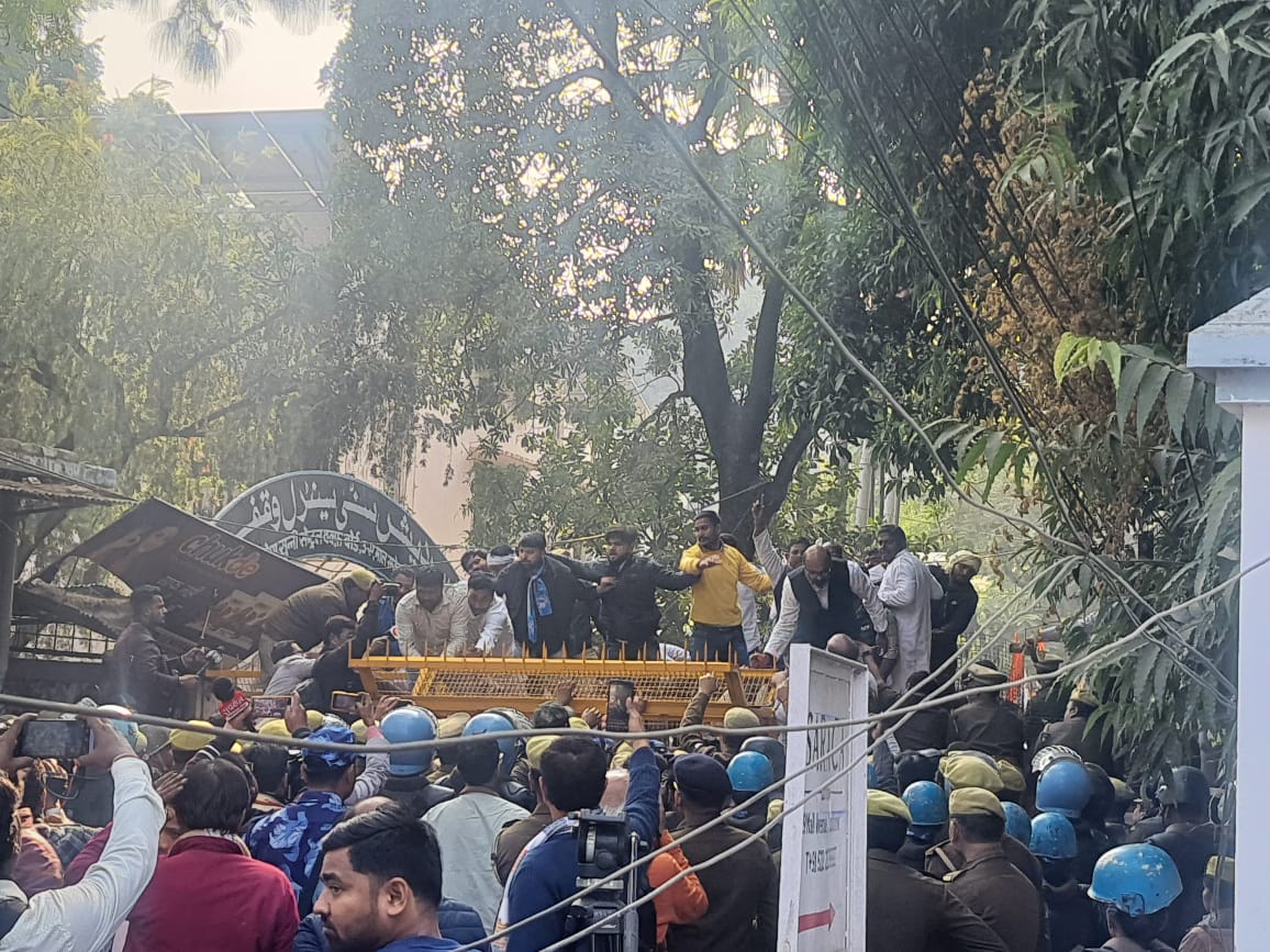पार्टी मुख्यालय के बाहर पुलिस ने नुकीली बैरीकेडिंग कार्यकर्ताओं की हत्या की साजिश के तहत लगाई गई है। कार्यकर्ताओं की जान लेने के लिए ऐसी बैरीकेडिंग लगाई गई है।