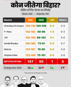 इस बार ज्यादा वोटिंग होने की वजह से एग्जिट पोल को लेकर लोगों में क्यूरियोसिटी काफी थी। हर कोई जानना चाहता था कि क्या नीतीश कुमार एक बार फिर सत्ता बरकरार रखने में कामयाब होते हैं या फिर तेजस्वी यादव की ताजपोशी होगी। वैसे, बिहार विधानसभा चुनाव की मतगणना 14 नवंबर को होगी।